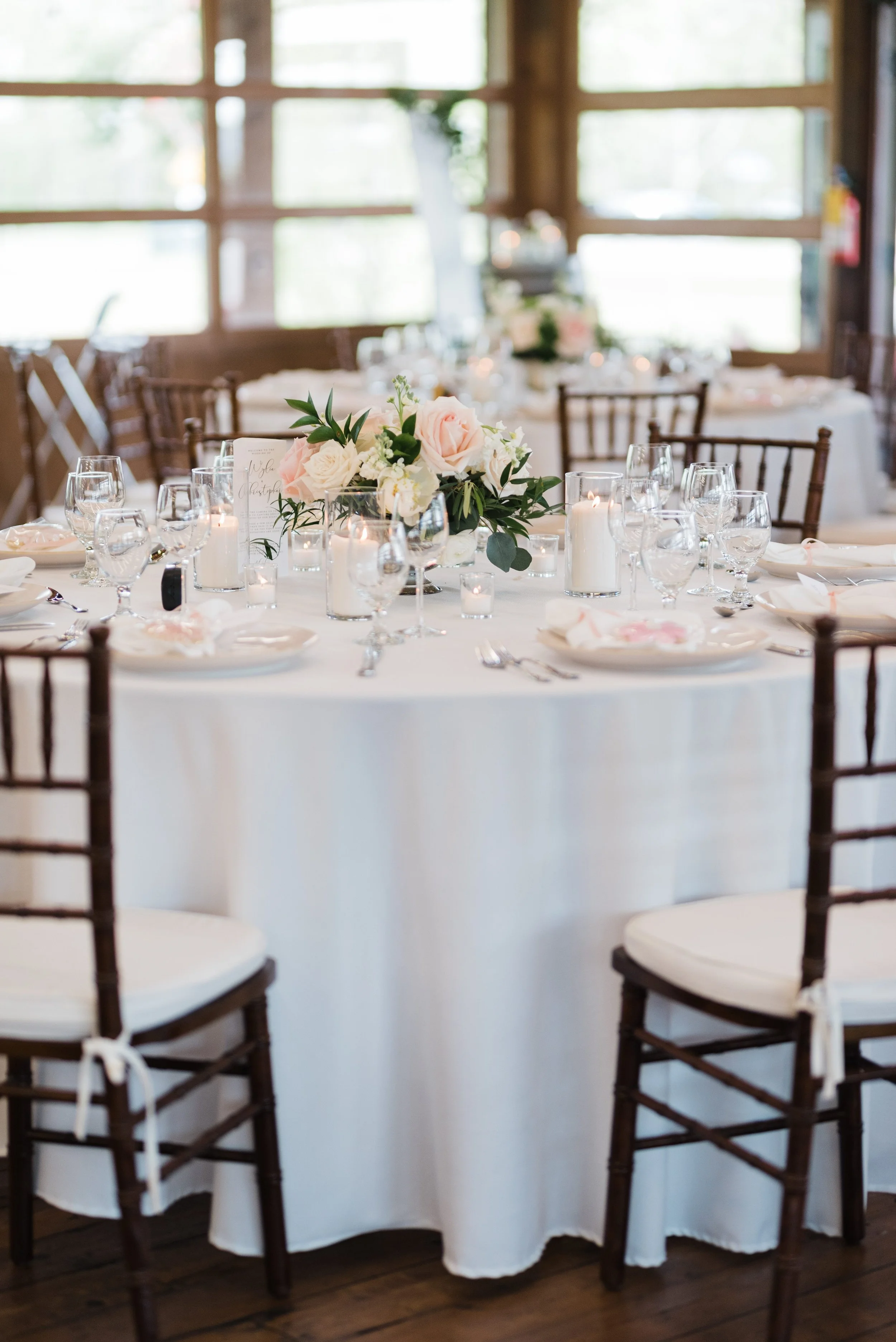 To reflect the orchard setting, the floral design executed by Roses + Twine was also a central element of Wylie and Christopher’s wedding day! The couple exchanged their vows beside a rose trellis that evoked classic romance as Wylie held a bouquet filled with roses, peonies, and snapdragons in coordinating ivory and blush tones. Later, the couple’s sweetheart table featured a greenery wall framed by lush pillars that repurposed their ceremony flowers. The fragrant roses surrounded them with beauty as they enjoyed their first meal as newlyweds!